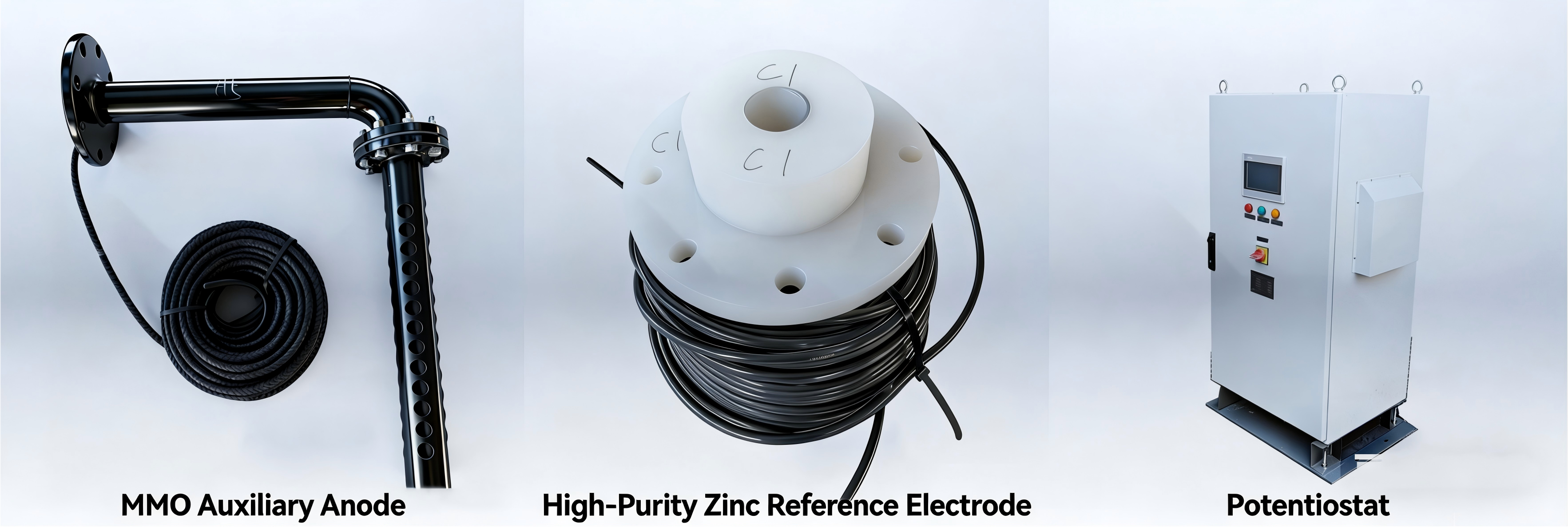 The system comprises three core components: MMO Auxiliary Anodes, High-Purity Zinc Reference Electrodes, and Potentiostats.